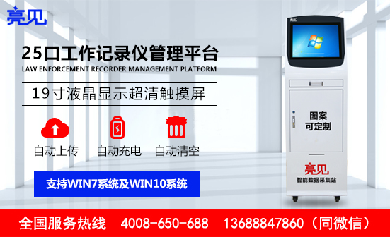 亮见执法记录仪数据采集工作站采用一体式人性化触摸屏设计,功能全自动,独立带锁定位,人性化的接入方式。数据采集工作站屏幕信息显示一目了然,每台执法记录仪对应的设备电量、设备编号,警员编号,设备姓名、同步时间、上传信息及状态等显示在屏幕上。为了用户以后的需求,亮见数据采集工作站采用挂载空间设计,在设计结构上预留了一定大的硬盘存放空间,当磁盘空间不足设定值时,数据采集工作站会发出警报,提醒用户及时处理。用户可以以后根据自己存储需求,便于安放添加存储硬盘。